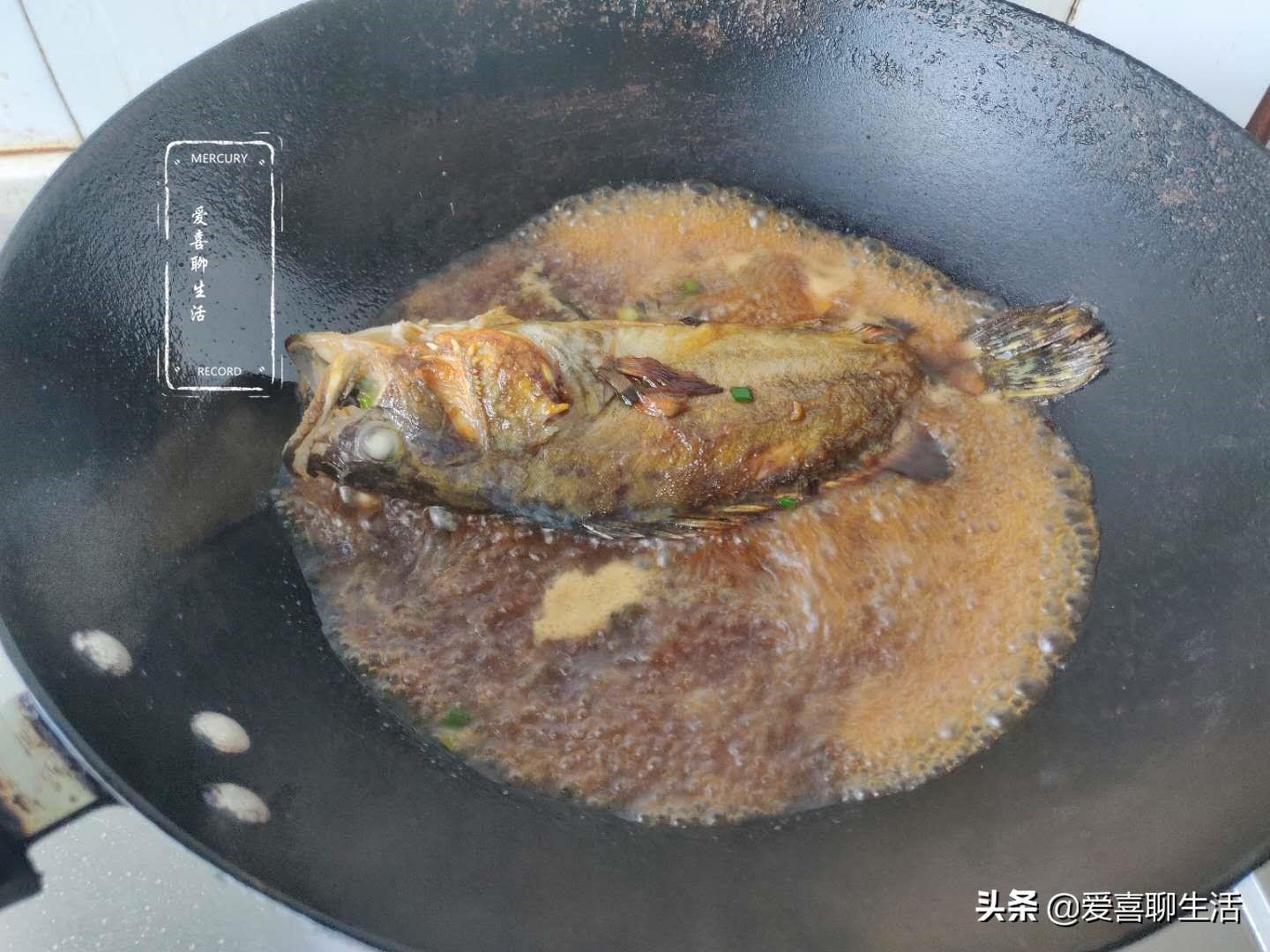 第四步 加入调料,煎制两面金黄后,加入葱姜蒜和3勺料酒爆香,然后加入香醋3勺,生抽2勺,老抽1勺上色,最后加入清水,与鱼齐平,大火烧开后转小火炖10分钟。