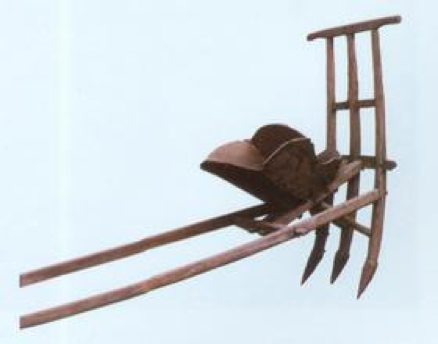 耧腿下面还有个金属的耧铧,耧铧向前行进时,便把土层向两边翻去,种子随即漏入,耕种时间长久的人从而总结出经验,通过晃动碰撞耧帮子的频率和声音大小就能知道一亩地中了多少种子呢。它可以播种大麦,小麦,大豆和高粱等等。
