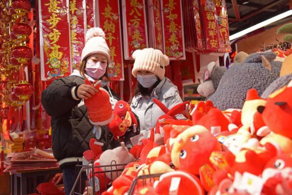 ↑1月20日,市民在江苏扬州东关历史街区购买兔子花灯。新华社发(齐立广 摄)